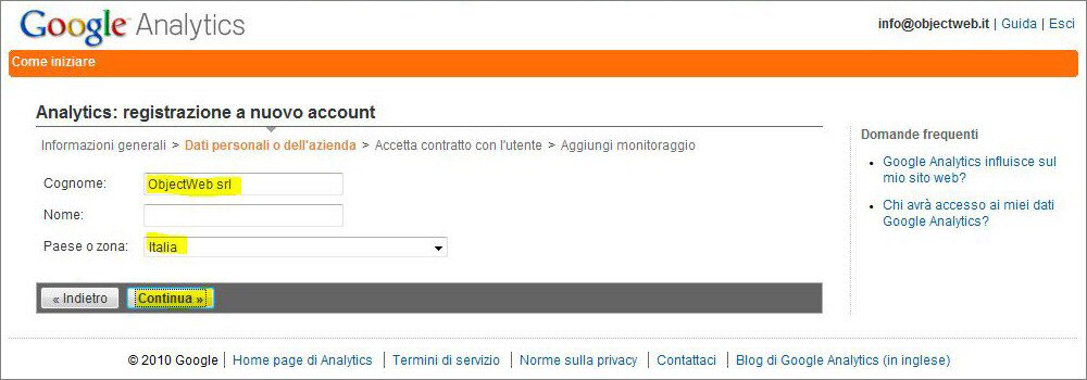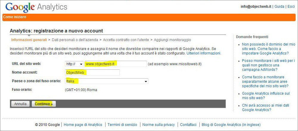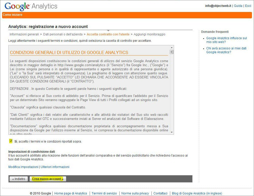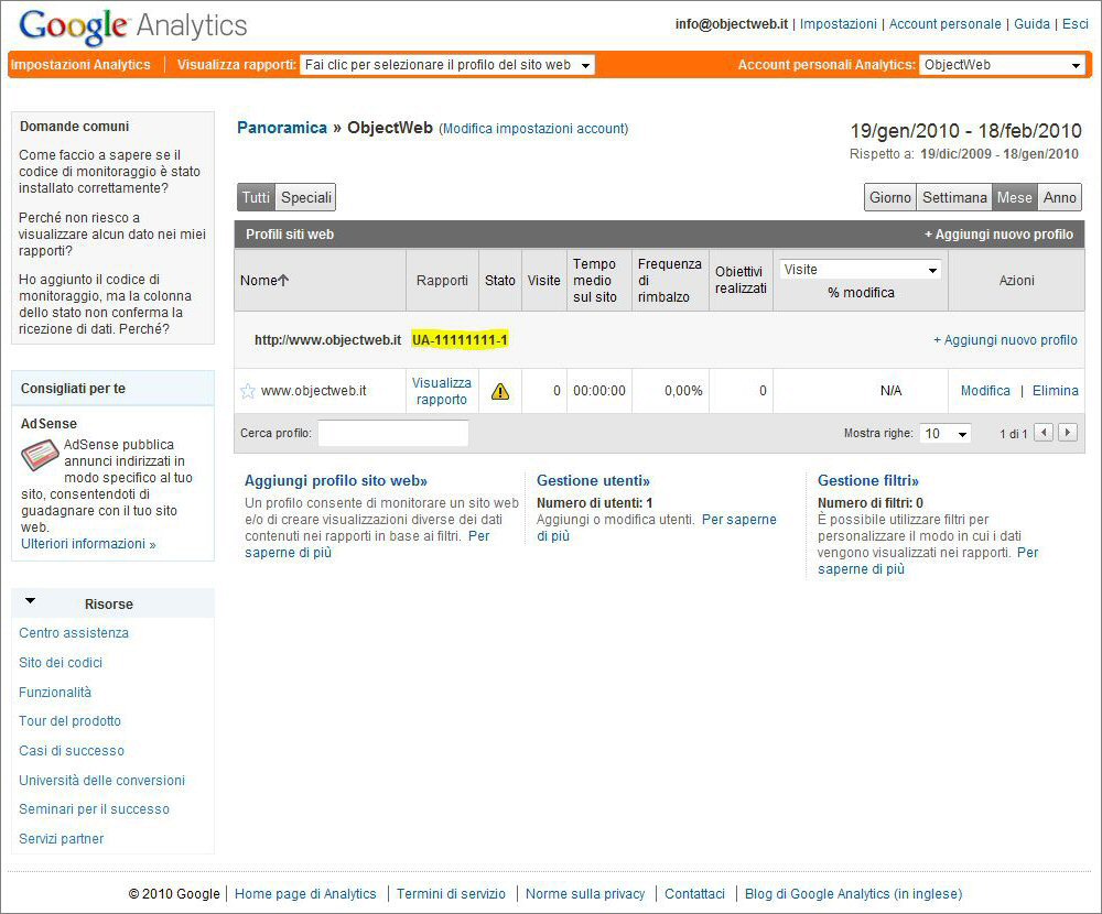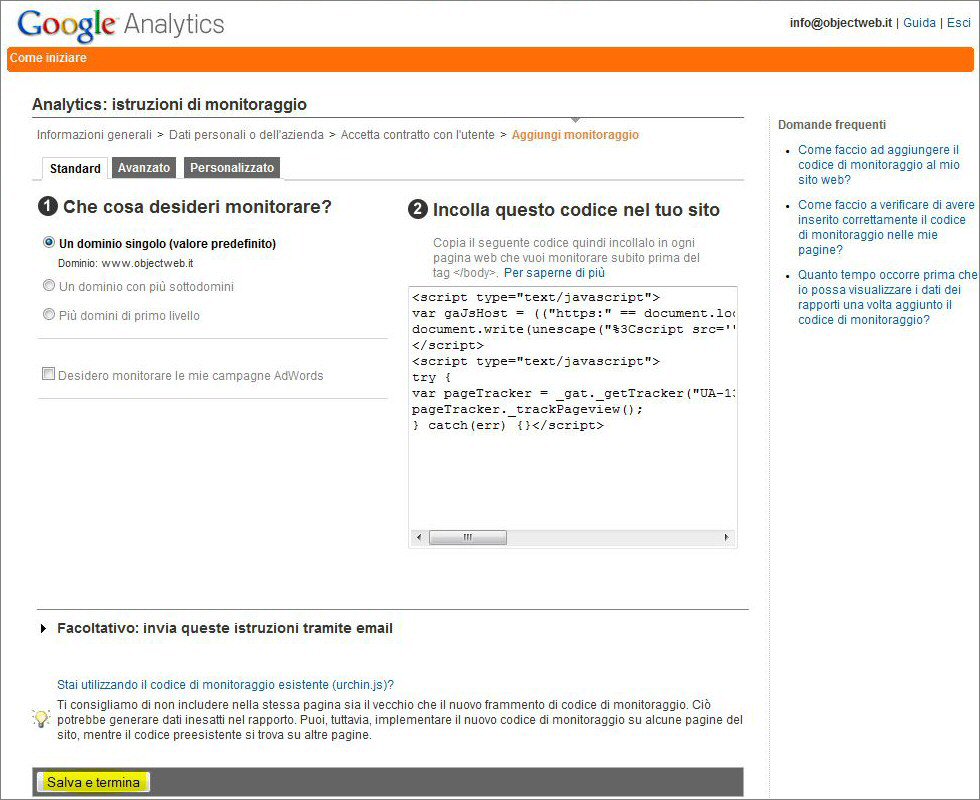 • Creazione account Google Analytics per il sito che si vuole monitorare